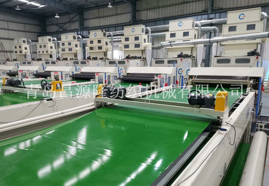 5. CYLPW-2200鋪網機:機架采(cǎi)用6mm鋼板折(shé)彎而成,鋪(pù)網簾之間加補償電機,減(jiǎn)少纖網牽伸(shēn)。往複換向用變頻控製,衝擊力小,能(néng)自動緩衝平衡換向,並配有多段速(sù)控製。底簾可調節升降,使棉網能按照所需要的單位克重均勻鋪疊到底簾上,供下一道工(gōng)序使用。斜簾﹑平簾和大車平簾(lián)用高檔優質皮簾,底簾和環簾為木簾子。