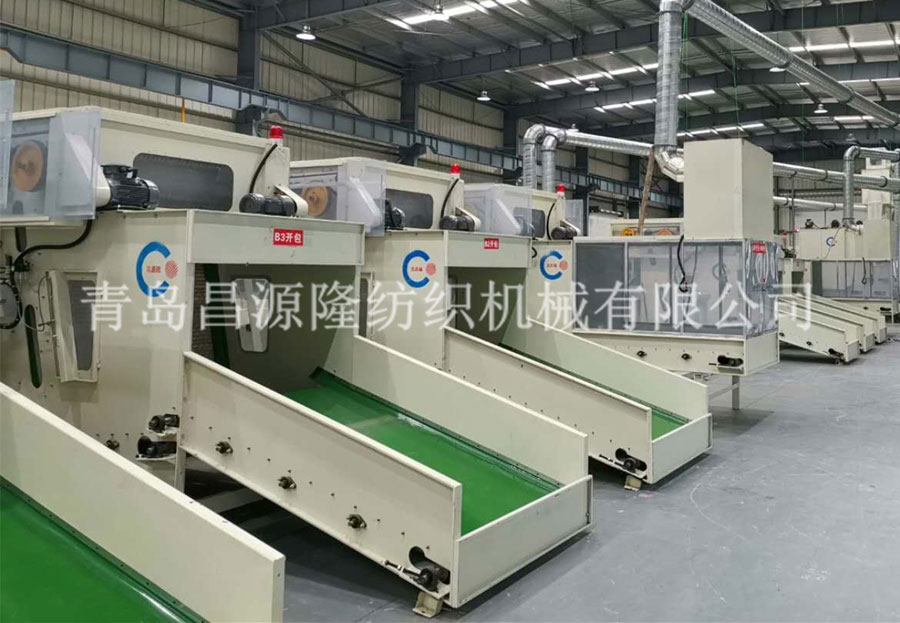 1.  CYKB-1200 開包機:開鬆各種捆包(bāo)纖維,按比例由電子秤進行稱量,均勻平鋪在混棉簾上。各種不同纖維被放入水(shuǐ)平輸送簾,經壓棉輥和對輥羅(luó)拉喂入,經高速打手開鬆後由輸棉風機送到下(xià)道工序。