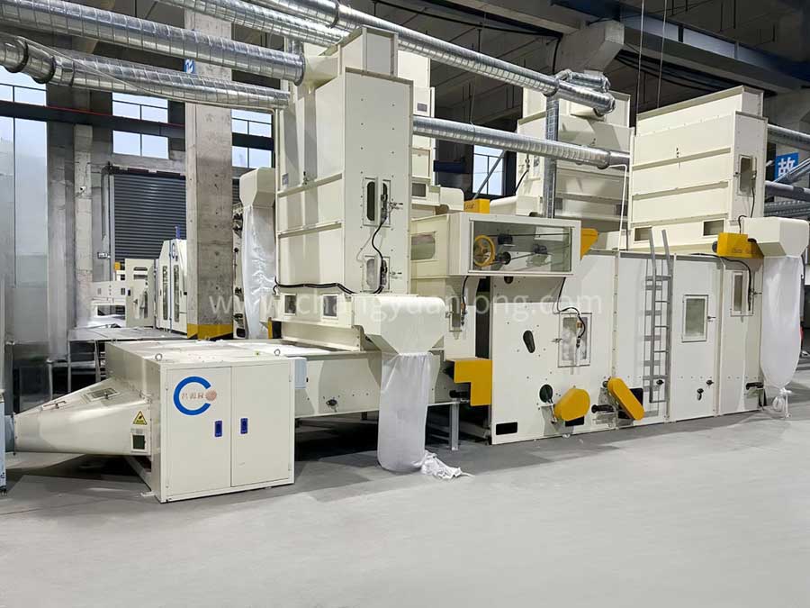 1. CYKB-1200 開包機:開鬆各種(zhǒng)捆(kǔn)包(bāo)纖維,按(àn)比例由電子秤進行稱量(liàng),均勻平鋪在混棉簾上。各種不同纖維被放入水平(píng)輸送簾,經壓棉輥和(hé)對輥(gǔn)羅拉喂入,經高速打(dǎ)手開鬆後由輸棉風機送到(dào)下道工序。