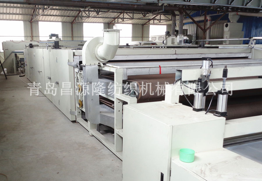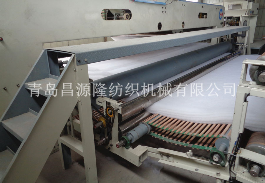 5. CYLPW-2200鋪網機:機架采用6mm鋼板折(shé)彎而(ér)成,鋪網簾之間加補償電機,減少纖網牽伸。往複換向用變頻控製,衝(chōng)擊力小,能自動緩衝平衡換(huàn)向,並配(pèi)有多段速控製。底簾可調節升降(jiàng),使棉網能按照所需要的單位克重均勻鋪疊到底簾(lián)上,供下一道(dào)工序使用。斜簾(lián)﹑平簾和(hé)大車平簾用高檔優質皮簾,底簾和環簾為木簾子。