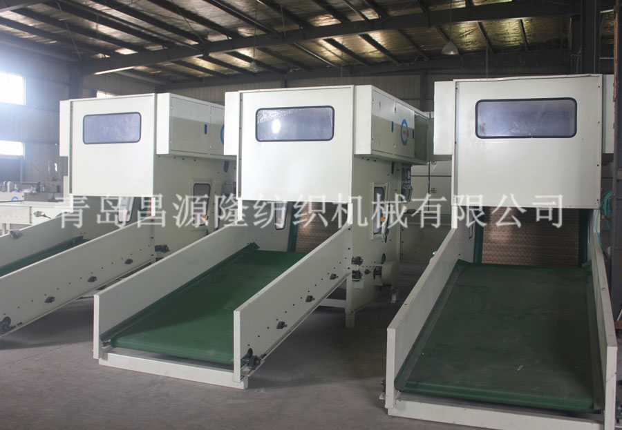 1. CYKB-1200 開包機:開鬆各種捆(kǔn)包纖維,按比(bǐ)例由(yóu)電(diàn)子秤進行稱量,均勻平鋪在混棉簾上。各種不同纖維被放入水平輸送簾,經壓棉(mián)輥(gǔn)和對輥羅拉喂(wèi)入,經高速打手(shǒu)開鬆後由(yóu)輸棉風機送到下道工序。