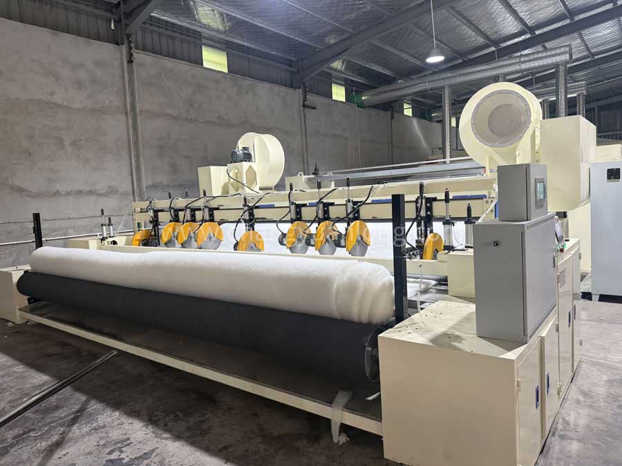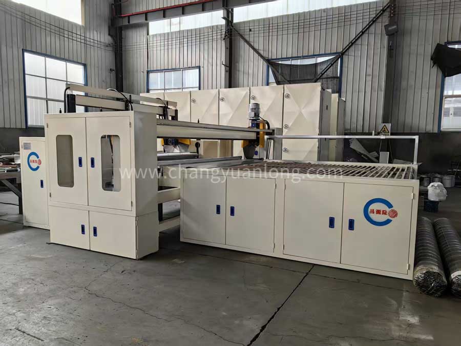 將(jiāng)經過定型機(jī)輸出的棉層,根據不同的尺(chǐ)寸要求,進(jìn)行切邊,自動收卷的機械